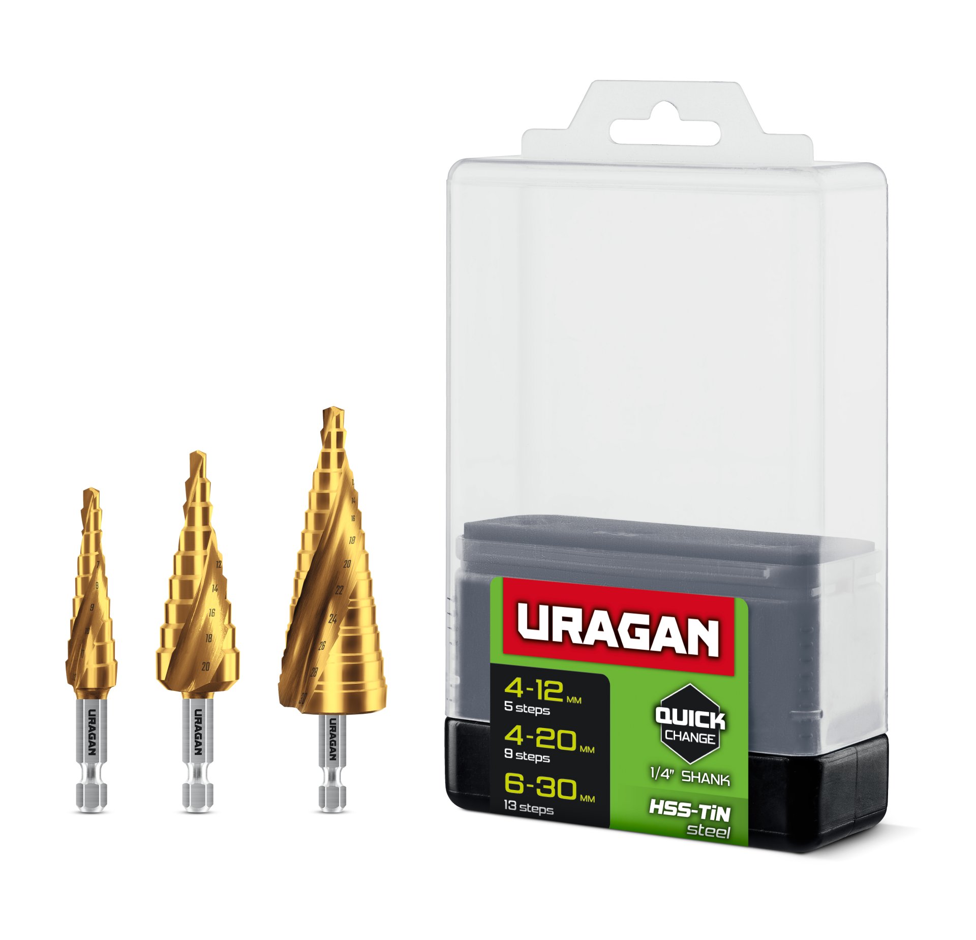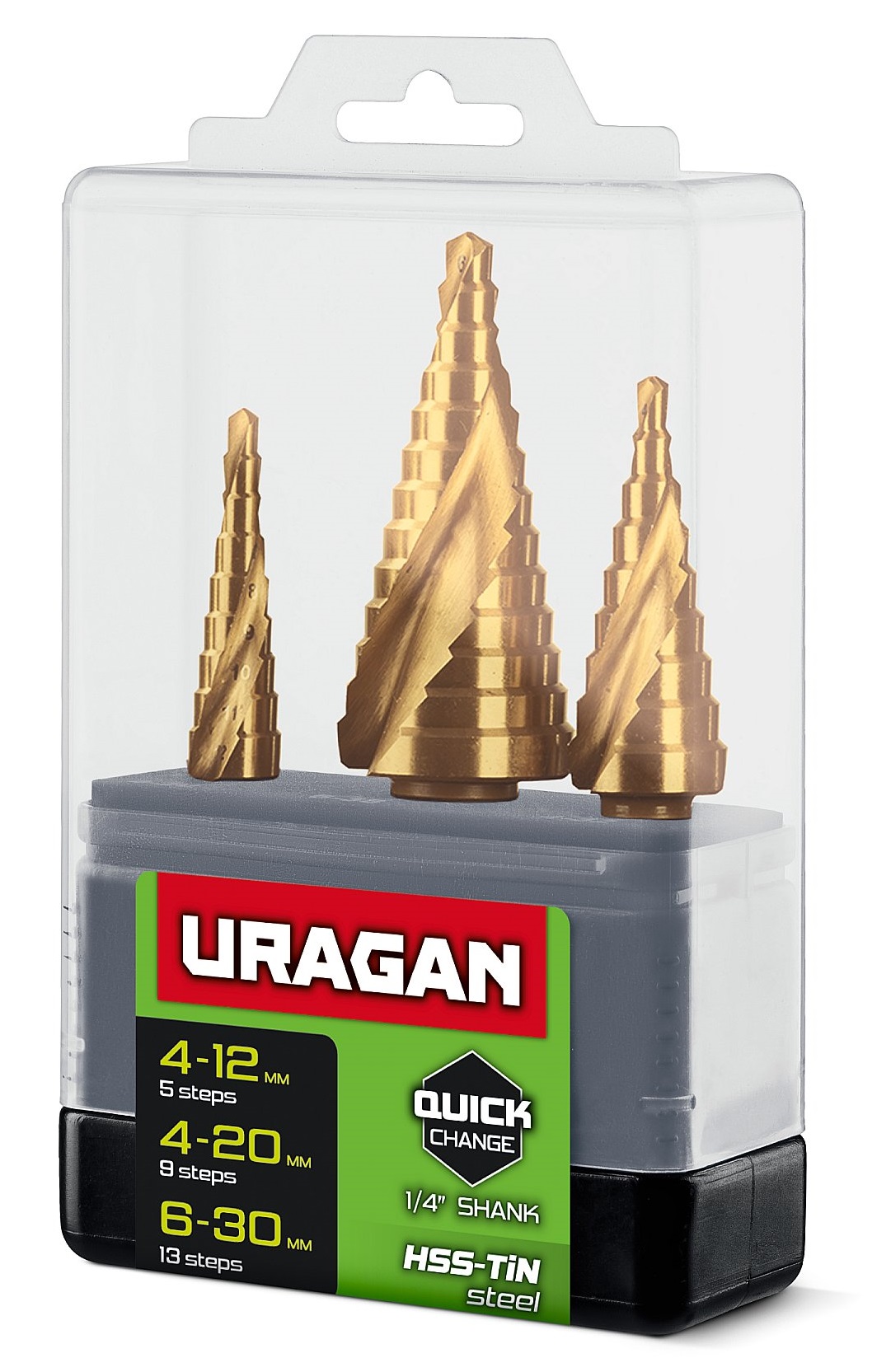 Набор сверл ступенчатых URAGAN 3 шт, 4-30мм, винтовая спираль, 29658-4-30-H3 - используется на стационарных станках, шуруповертов и с электродрелями для сверления металлических конструкций и заготовок, листовых материалов, цветных металлов, пластика.