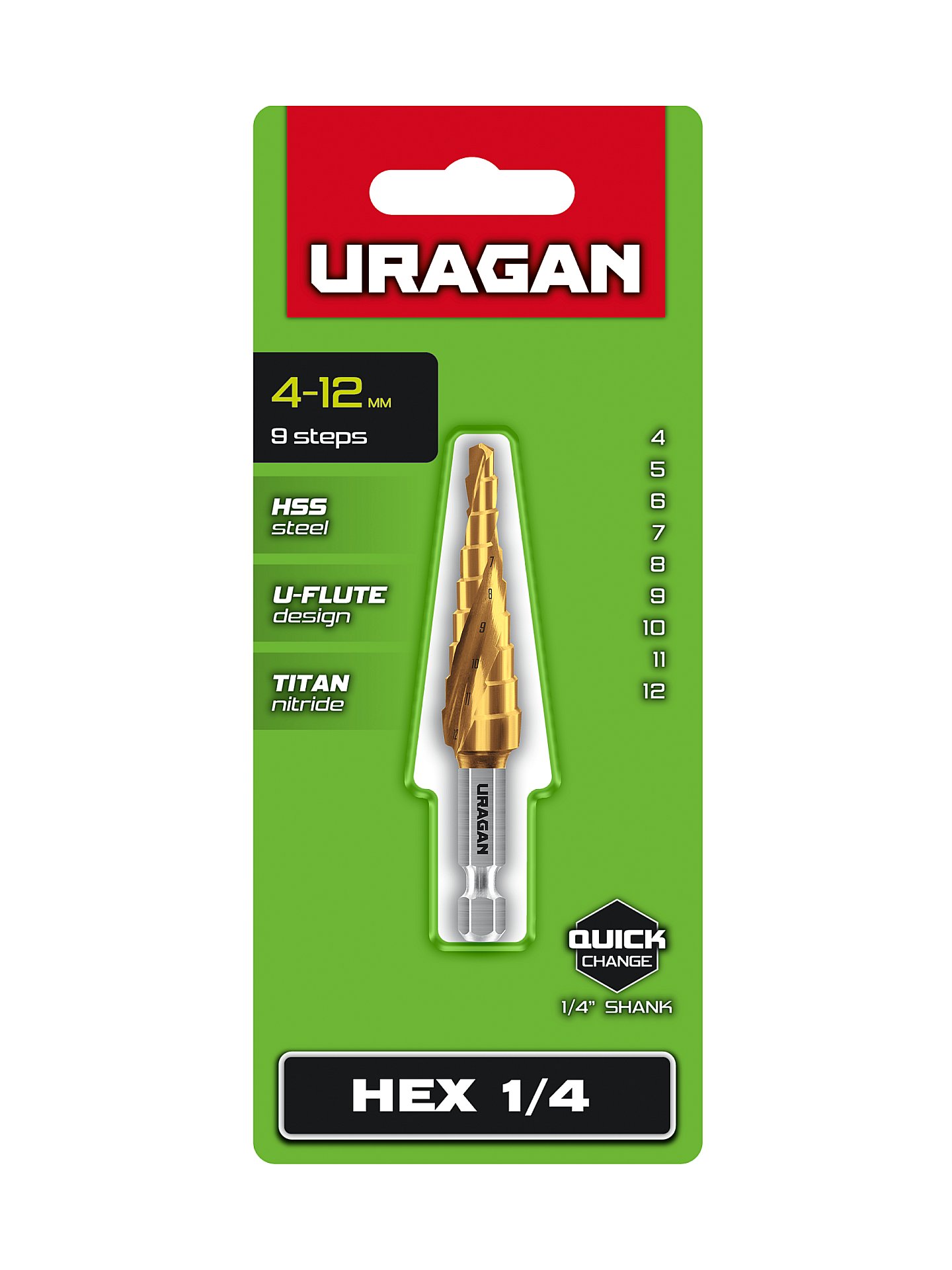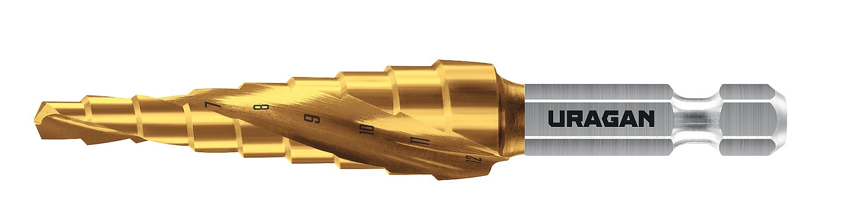 Сверло ступенчатое URAGAN 4-12мм, 9 ступеней, винтовая спираль, 29658-4-12-9 - используется на стационарных станках, шуруповертов и с электродрелями для сверления металлических конструкций и заготовок, листовых материалов, цветных металлов, пластика.