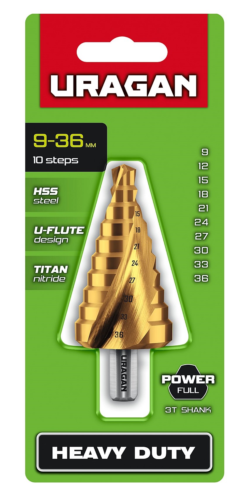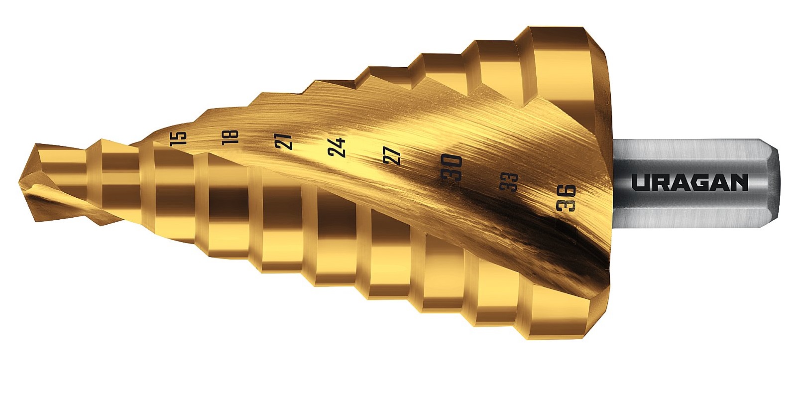 Сверло ступенчатое URAGAN 9-36мм, 10 ступеней, винтовая спираль, 29658-9-36-10 - используется на стационарных станках, шуруповертов и с электродрелями для сверления металлических конструкций и заготовок, листовых материалов, цветных металлов, пластика.