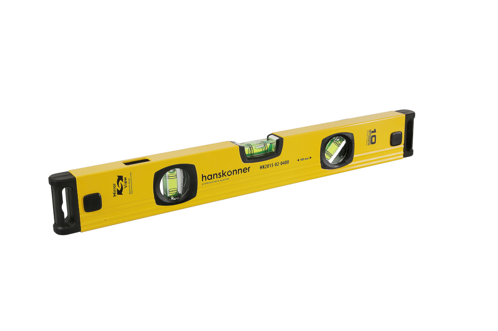 Уровень 400 мм, фрезеров., 3 глазка (1 зеркальн.), точн. 0.5мм/м, Hanskonner HK2015-02-0400 — применяется для оценки соответствия поверхностей вертикальной или горизонтальной плоскости, а также для измерения углового отклонения поверхности от горизонтали или вертикали.