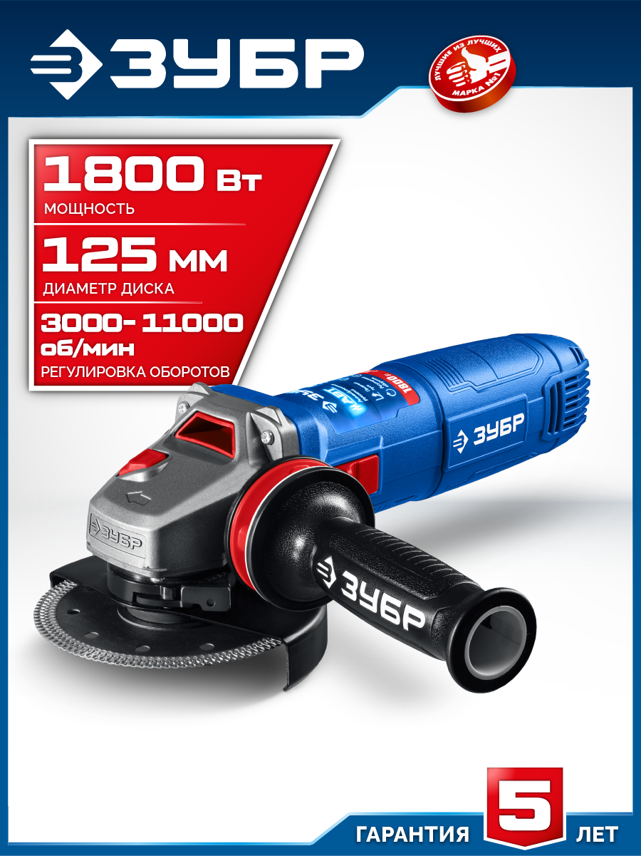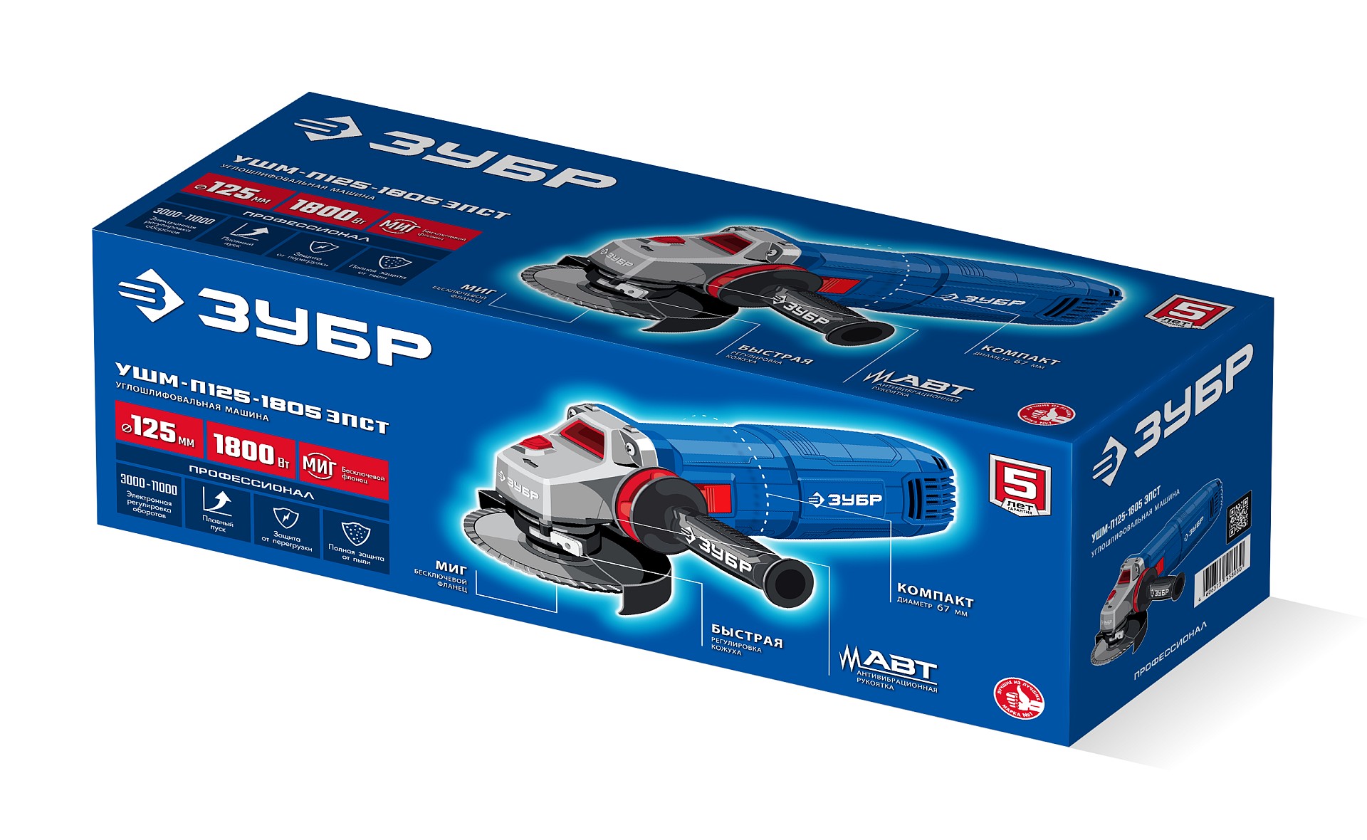 УШМ ЗУБР УШМ-П125-1805 ЭПСТ, 1800 Вт, d125 мм, регулировка оборотов, фланец «МИГ», Профессионал — одноручная УШМ с максимальной в линейке машин ЗУБР мощностью 1800 Вт и регулировкой оборотов максимально эффективна для всех видов работ — резки металла, кирпича, керамики, зачистки, шлифовки и обдирки. Электронные системы защиты пользователя и изделия, а также антивибрационная рукоятка для эффективного гашения вибрации.