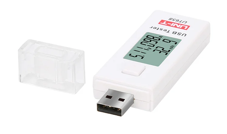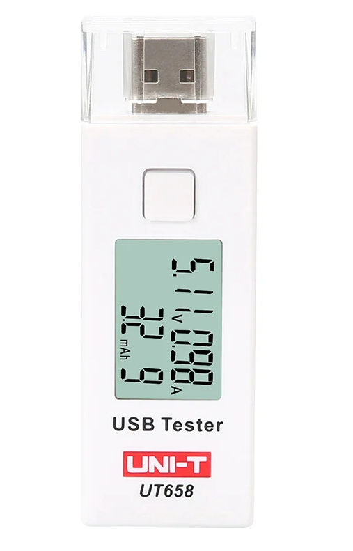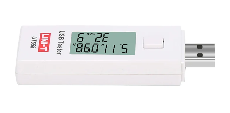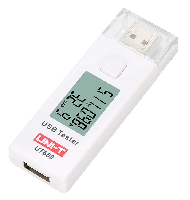 UT658 UNI-T тестер USB — представляет собой малоразмерный цифровой контрольно-измерительный прибор, выполненный в форм-факторе флешки с входным USB-коннектором типа A и выходным гнездом под такой же соединитель.