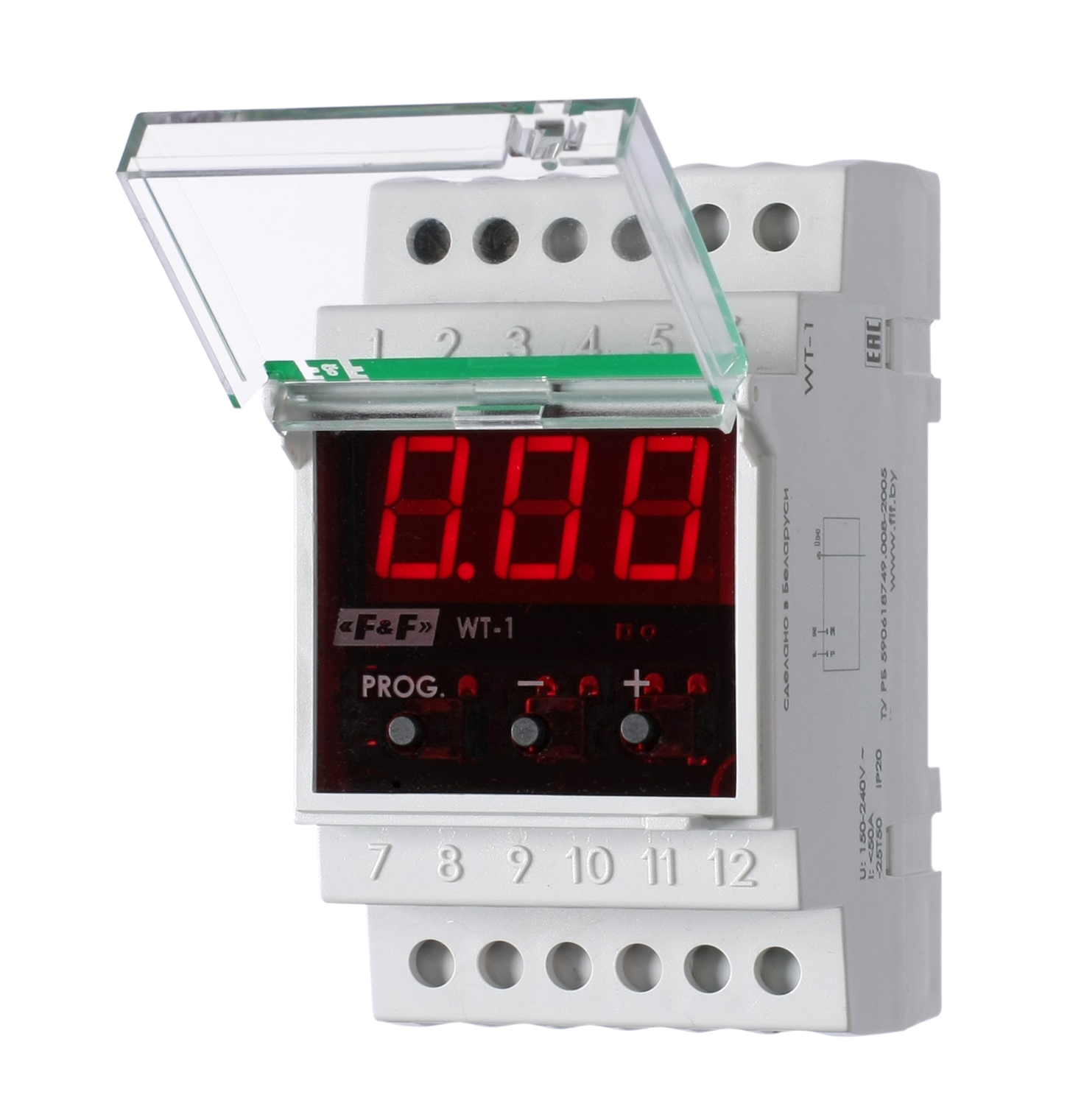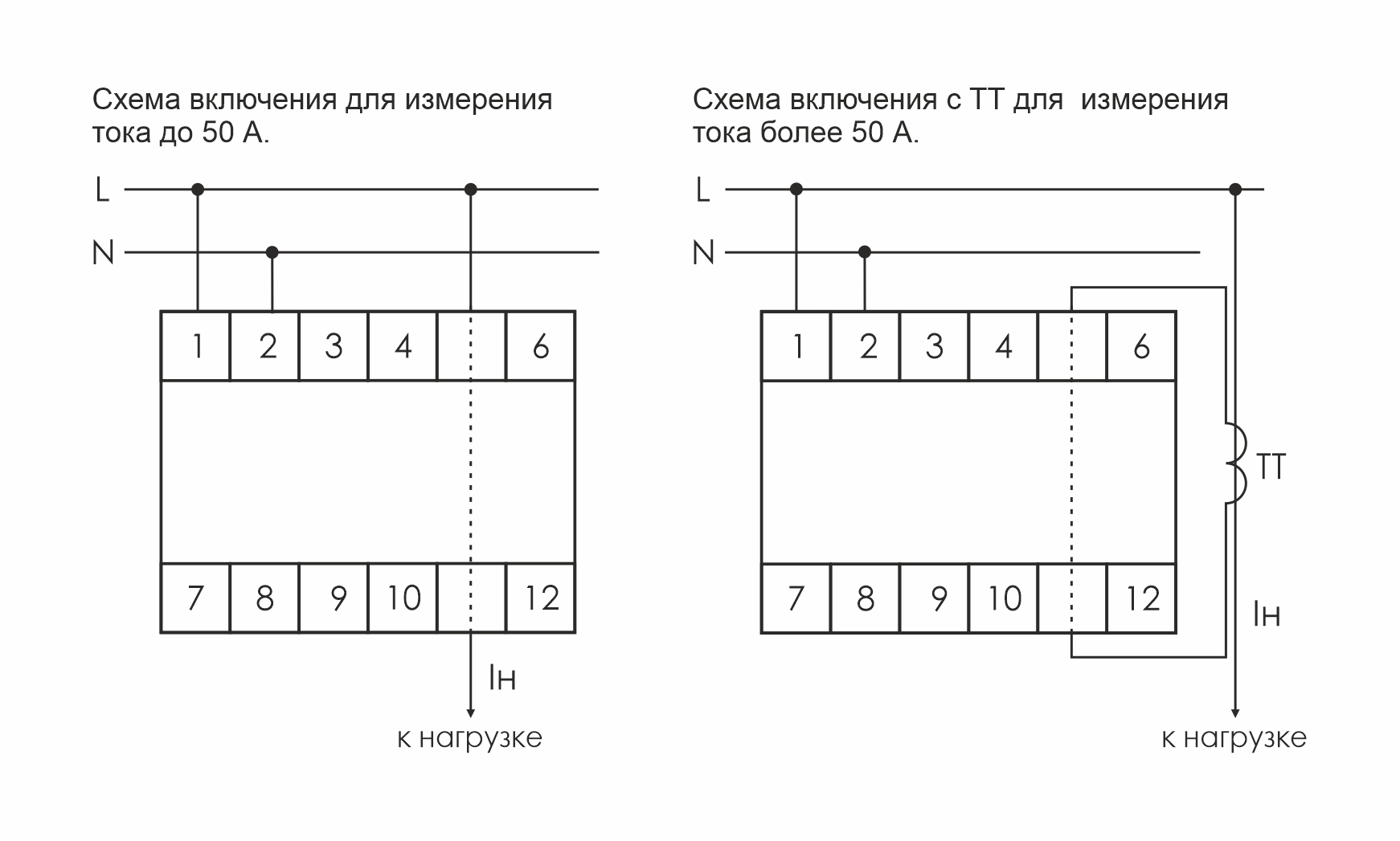 Указатель тока измеряет величину переменного тока в подключенном к нагрузке проводе, пропущенном через сквозное отверстие в корпусе указателя. Преобразованная в цифровое значение величина тока отображается на однорядном LED индикаторе. Максимальная величина переменного тока при прямом измерении указателем тока не превышает 50 A. Для измерения тока величиной более 50 A используется внешний трансформатор тока.