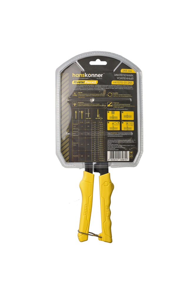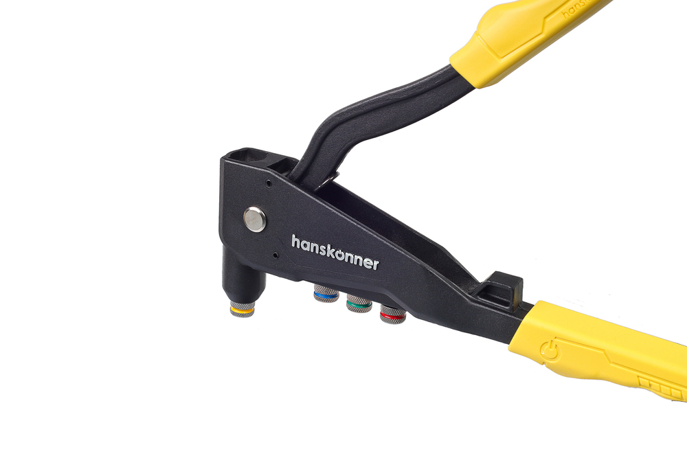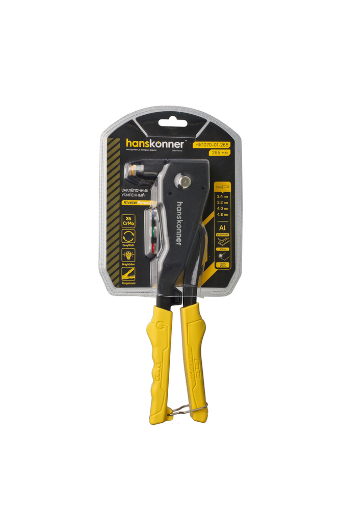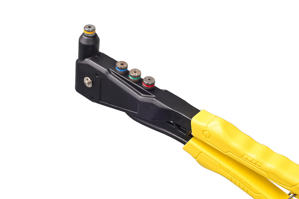 Литой усиленный заклёпочник применяется для надежного соединения металлических профилей, тонкостенных конструкций, плоских заготовок и деталей при помощи вытяжных заклепок из стали (2,4-4,0 мм), алюминия (2,4-4,8 мм) и нержавеющей стали (2,4-3,2 мм). Для установки крепежа не требуется особых усилий благодаря кованому изогнутому рычагу и корпусу из алюминиевого сплава.