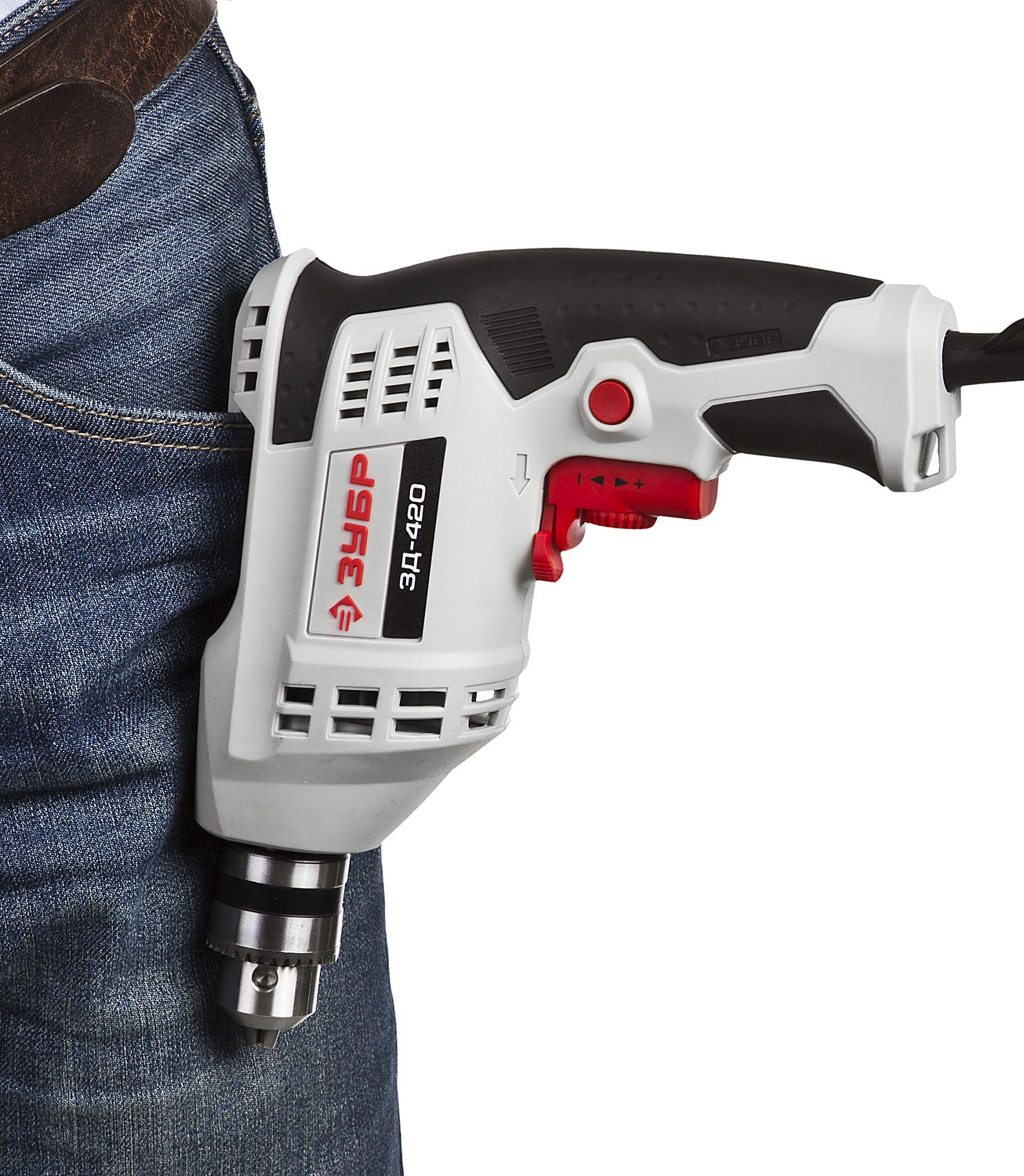 Дрель безударная электрическая ЗУБР ЗД-420ЭРМ2, предназначена для точного сверления отверстий в различных материалах, а также может использоваться для заворачивания крепежных изделий. Компактная и почти невесомая дрель с металлическим кулачковым патроном, надежной конструкцией на подшипниках - лучший подарок мастеру. Надежный инструмент для эффективной, качественной работы. Удобная, компактная и легкая дрель для точного сверления. Цельнометаллический ключевой патрон для выполнения полноценных задач. Электронная регулировка оборотов в широком диапазоне расширяет возможности использования изделия. Изменение частоты вращения степенью нажатия на выключатель обеспечивает как плавное начало сверления во избежание увода сверла, так и быстрое сверление. Надежная конструкция на шариковых подшипниках обеспечивает минимальное биение и позволяет сверлить отверстия диаметром до 3 мм. Изменение направления вращения (реверс) позволяет использовать изделие в качестве шуруповерта.
