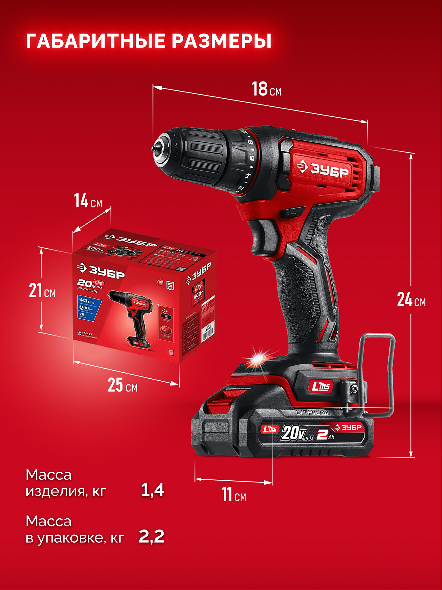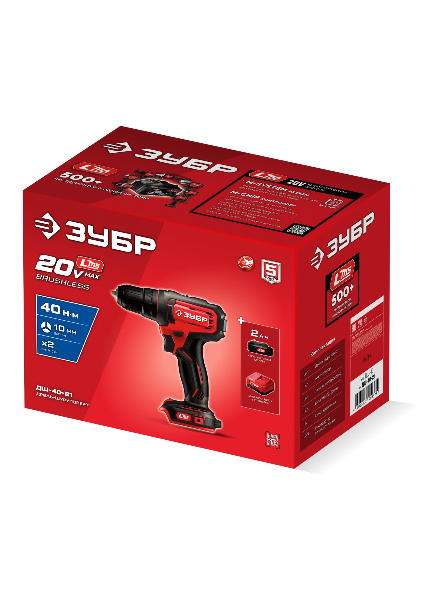 ДШ-40-21 Дрель-шуруповерт ЗУБР 20 В, 40 Н·м, 1 АКБ LMS (2 А·ч) - предназначена для сверления отверстий в различных материалах (при установке соответствующих сверл), закручивания/откручивания резьбовых соединений (при установке соответствующих бит), перемешивания ЛКМ (при установке соответствующих насадок).
