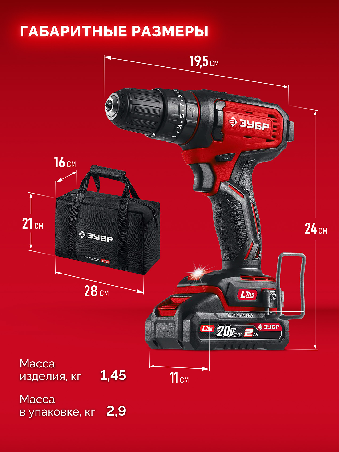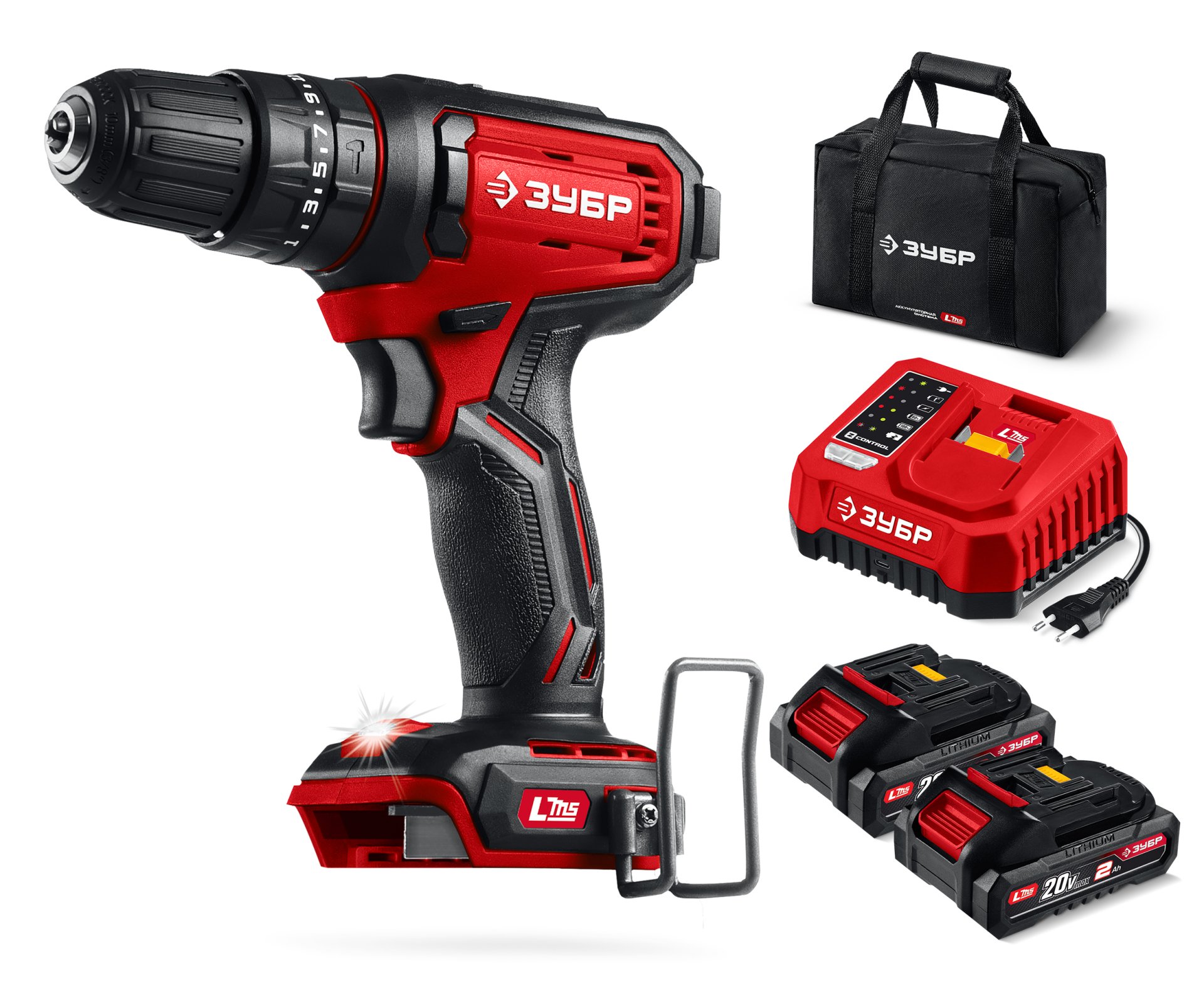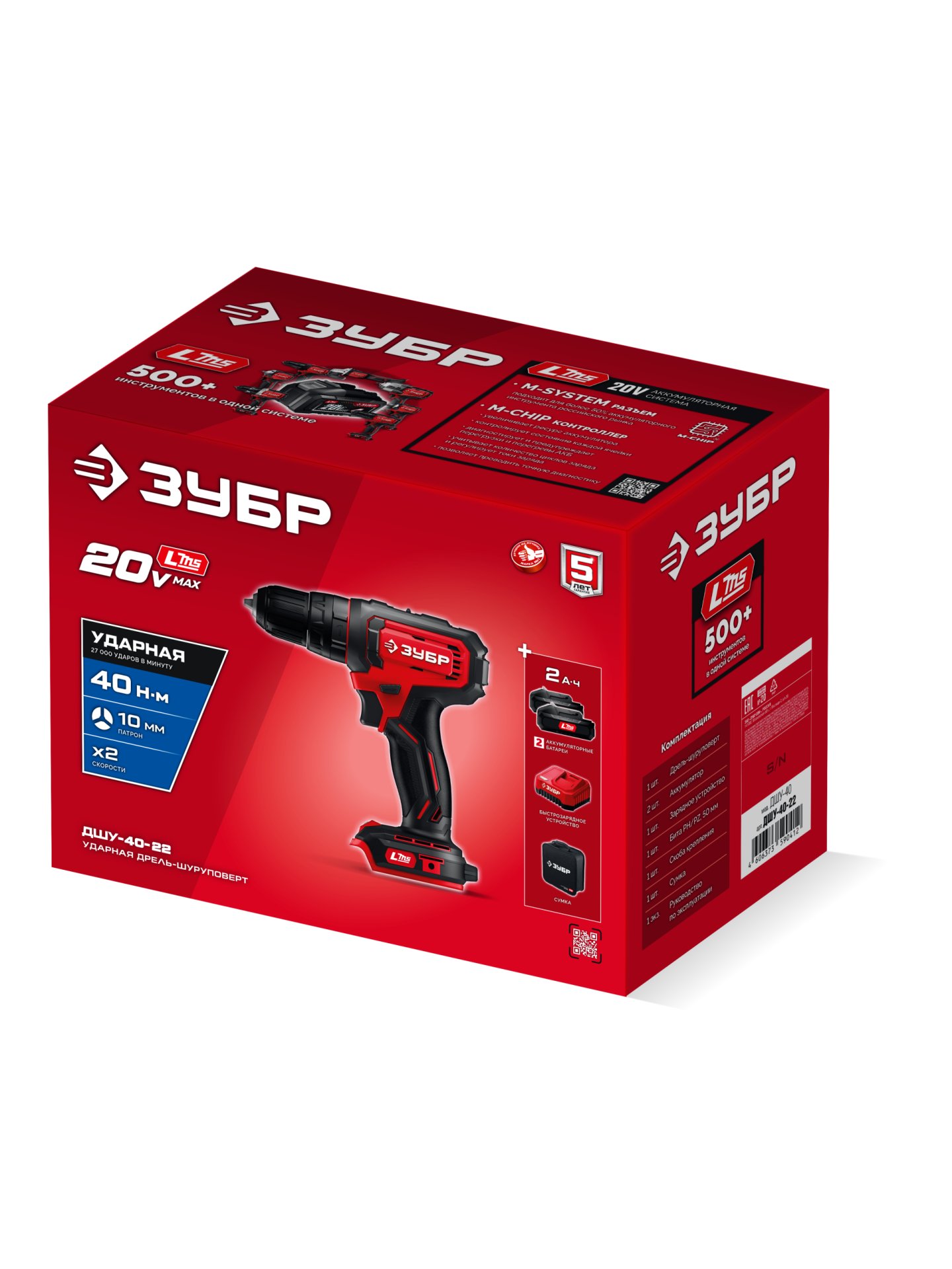 Ударная дрель-шуруповерт, сумка ЗУБР 20 В, 40 Н·м, 2 АКБ LMS (2 А·ч) ДШУ-40-22 - предназначена для сверления отверстий в различных материалах (при установке соответствующих сверл), закручивания/откручивания резьбовых соединений (при установке соответствующих бит), перемешивания ЛКМ (при установке соответствующих насадок).