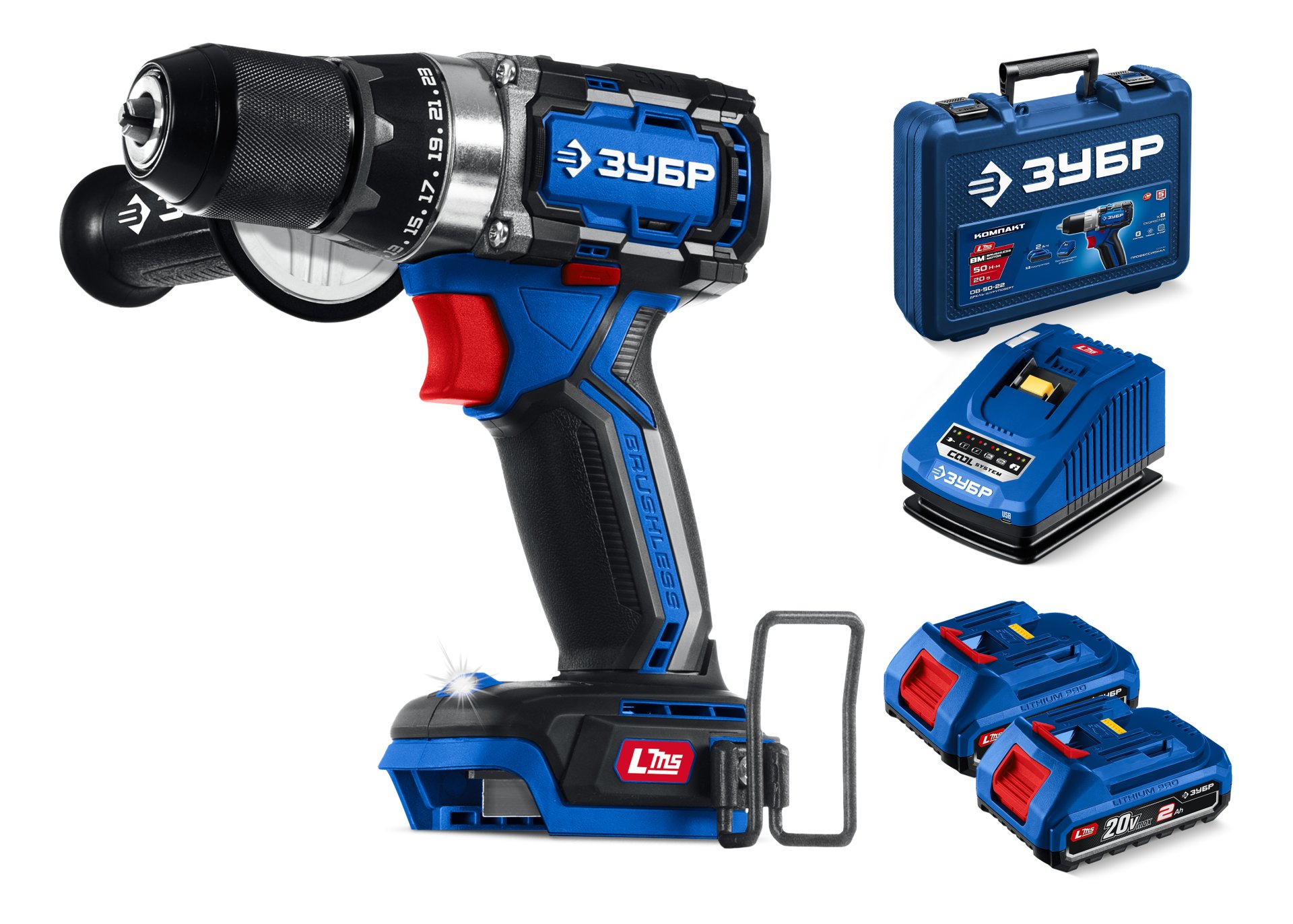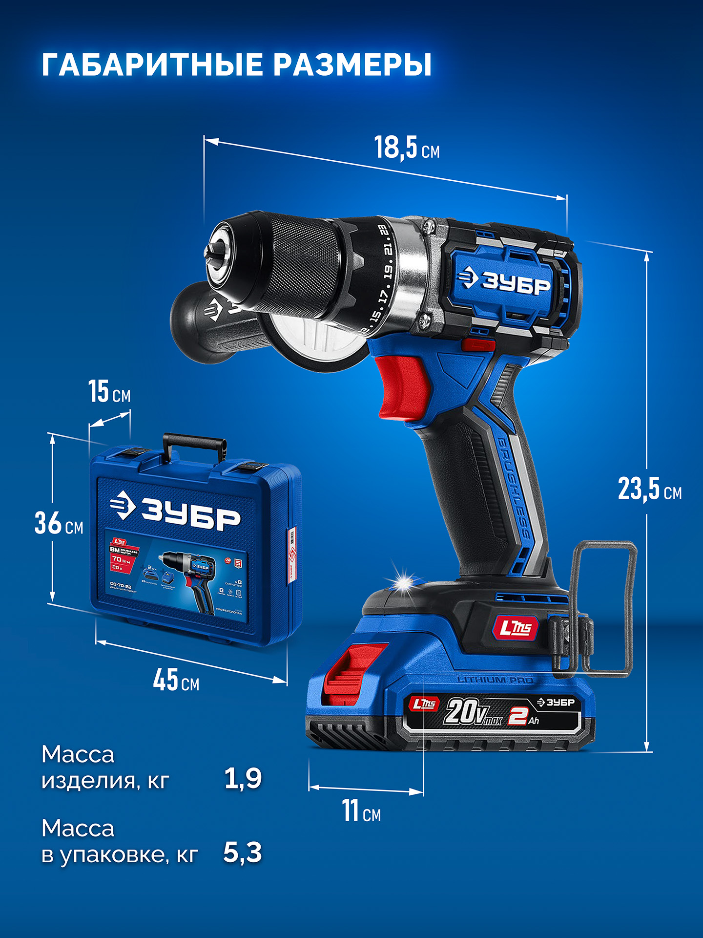 Бесщеточная дрель-шуруповерт, кейс, ЗУБР 20 В, 70 Н·м, 2 АКБ LMS (2 А·ч), ПРОФЕССИОНАЛ DB-70-22 - предназначена для сверления отверстий в различных материалах (при установке соответствующих сверл), закручивания/откручивания резьбовых соединений (при установке соответствующих бит), перемешивания ЛКМ (при установке соответствующих насадок).