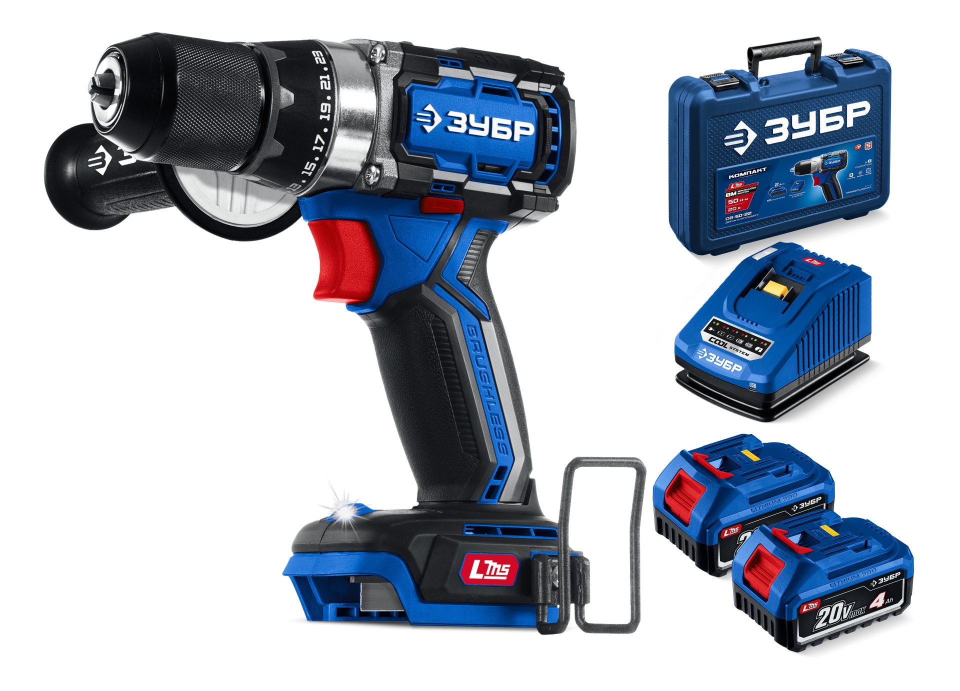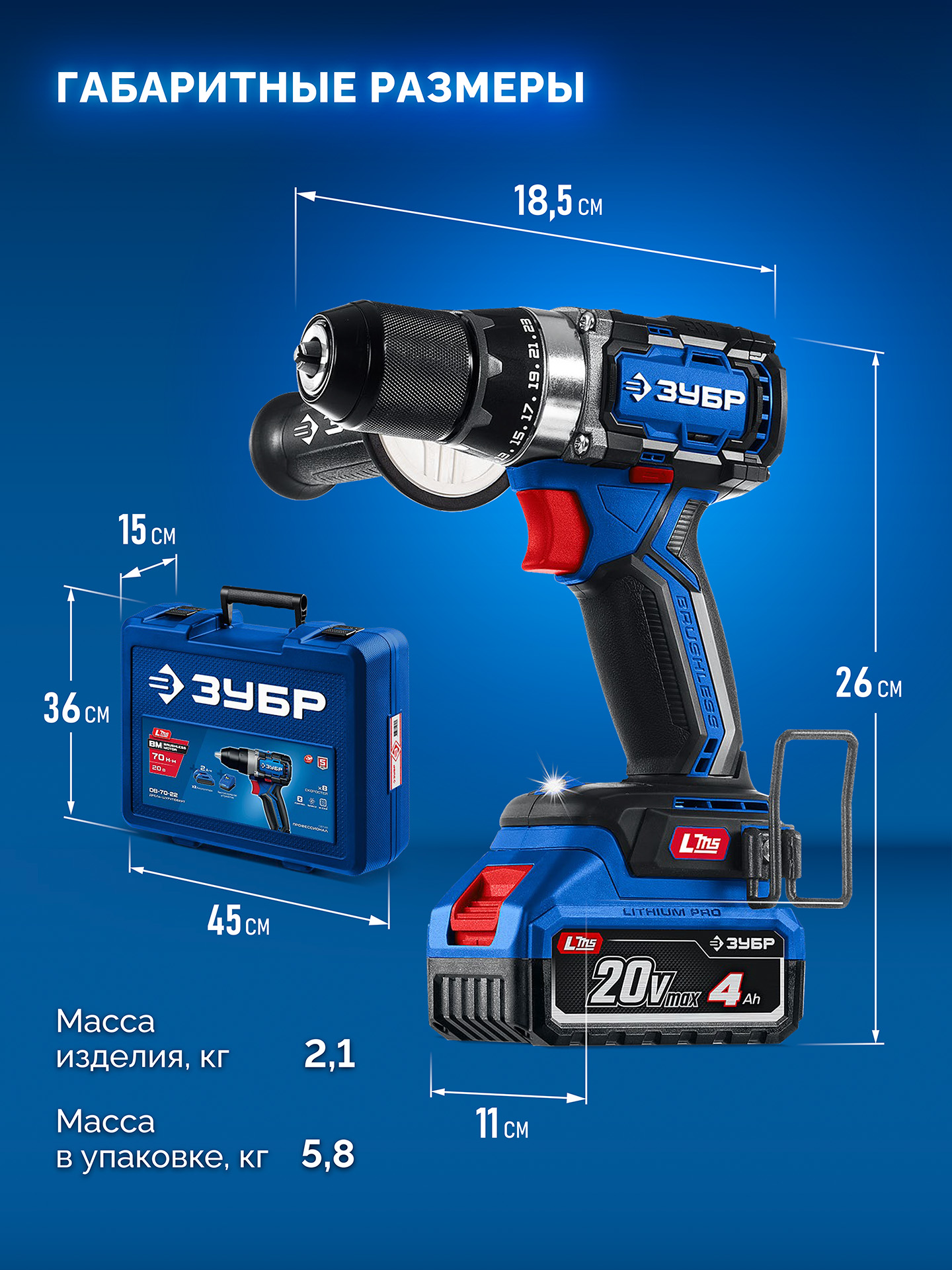 Бесщеточная дрель-шуруповерт, кейс, ЗУБР 20 В, 70 Н·м, 2 АКБ LMS (4 А·ч), ПРОФЕССИОНАЛ DB-70-42 - предназначена для сверления отверстий в различных материалах (при установке соответствующих сверл), закручивания/откручивания резьбовых соединений (при установке соответствующих бит), перемешивания ЛКМ (при установке соответствующих насадок).