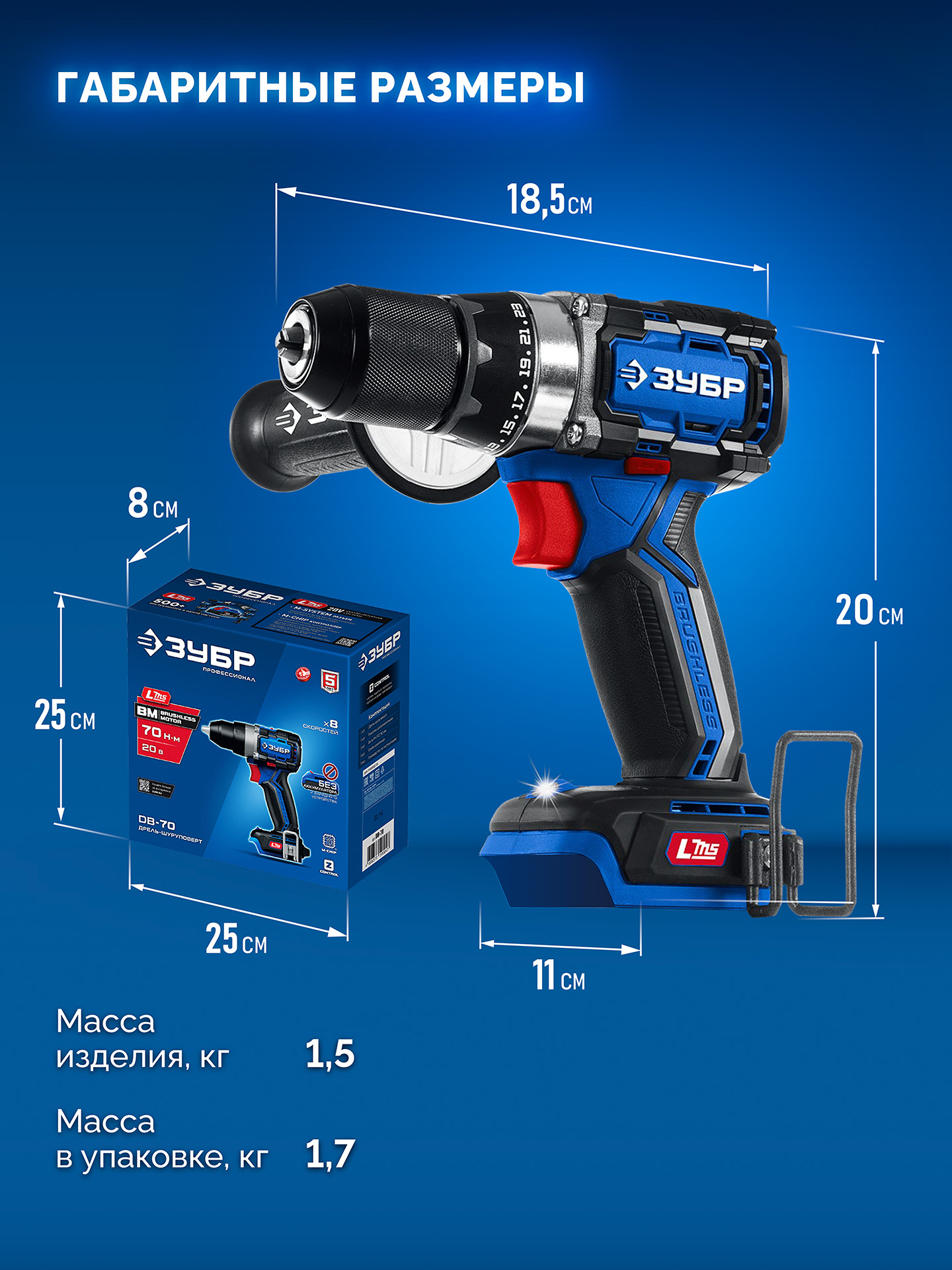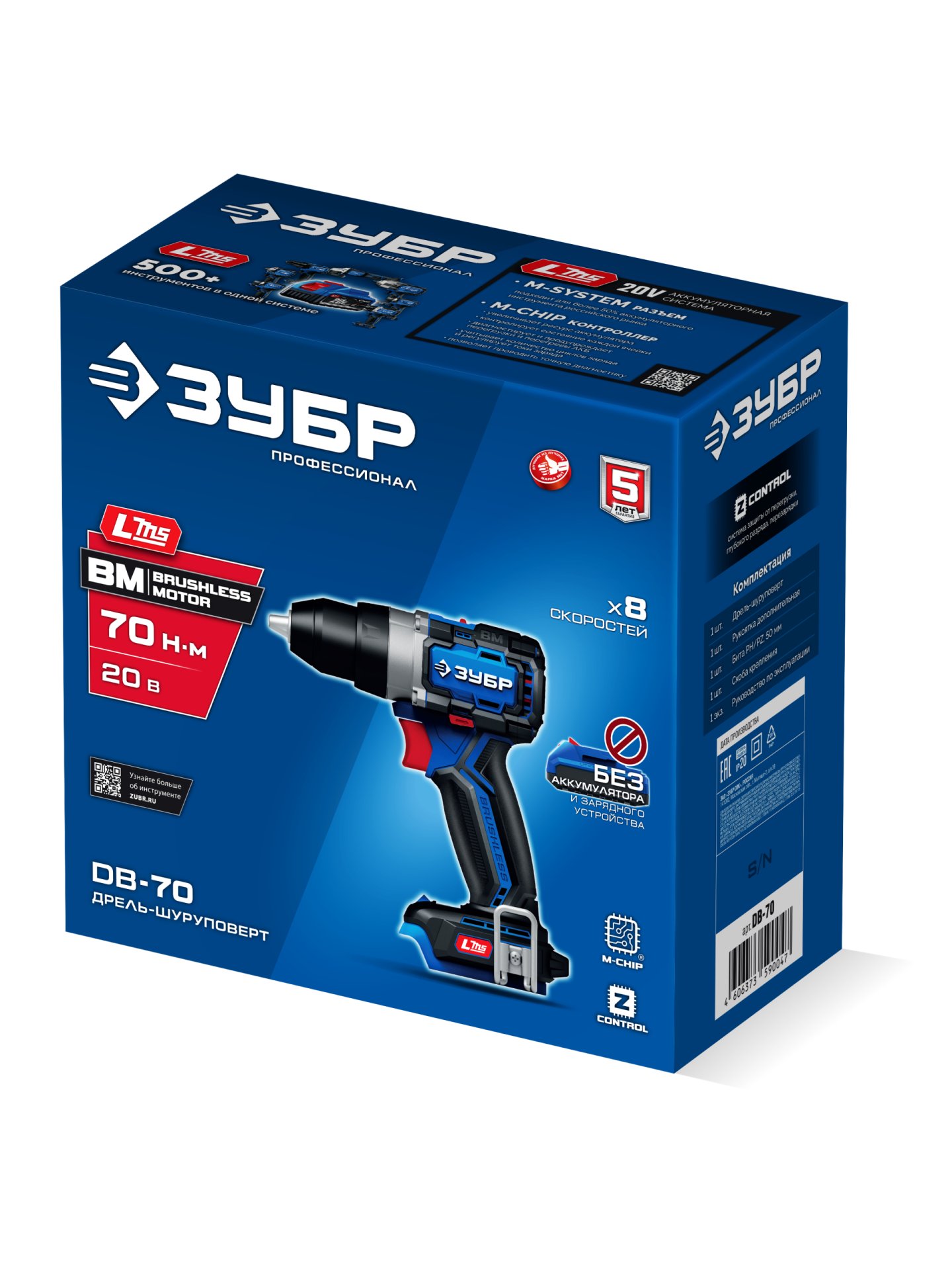 DB-70 Бесщеточная дрель-шуруповерт, ЗУБР 20 В, 70 Н·м, без АКБ (LMS), ПРОФЕССИОНАЛ - предназначена для сверления отверстий в различных материалах (при установке соответствующих сверл), закручивания/откручивания резьбовых соединений (при установке соответствующих бит), перемешивания ЛКМ (при установке соответствующих насадок).