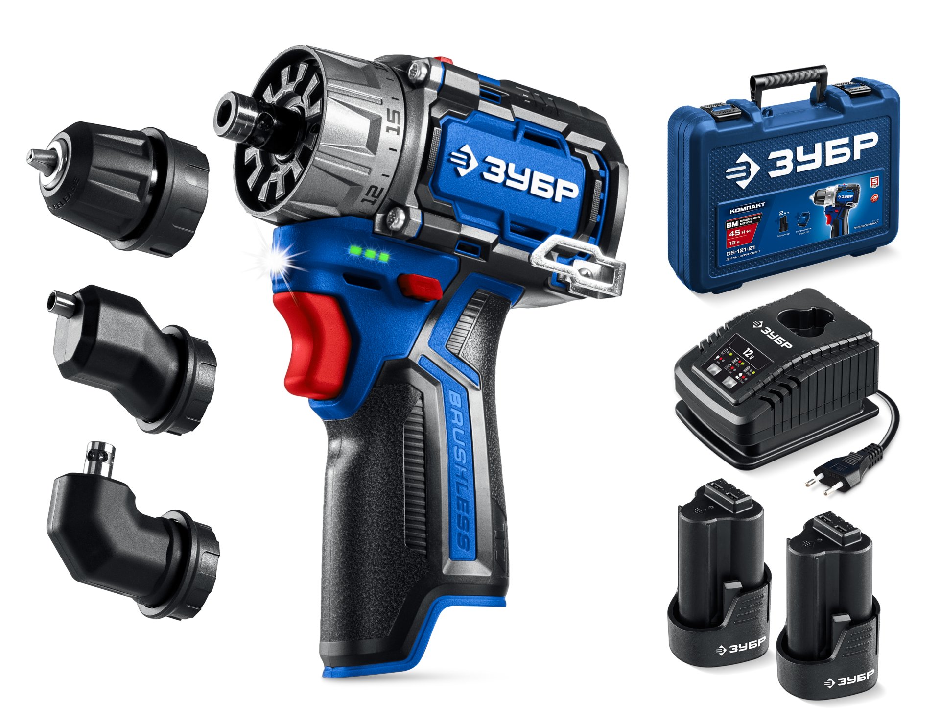 - Дрель-шуруповерт - 1 шт. Патрон кулачковый - 1 шт. Патрон эксцентриковый - 1 шт. Патрон угловой - 1 шт. Аккумулятор - 2 шт. Зарядное устройство - 1 шт. Битодержатель - 1 шт. Бита (50 мм, PH, PZ) - 1 шт. Скоба поясная - 1 шт. Кейс - 1 шт. Руководство по эксплуатации - 1 шт.