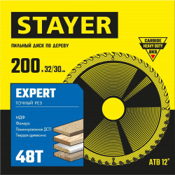 Диск пильный по дереву 200 мм, STAYER 3682-200-32-48_z01 — предназначен для точных, качественных пропилов фанеры, столярных плит и щитов, паркетной доски, прессованной клееной древесины, МДФ, ламинированной ДСП, комбинированных материалов. Применяется на ручных циркулярных пилах, станковых и торцовочных пилах. Отличается повшенным ресурсом и низким уровнем шума